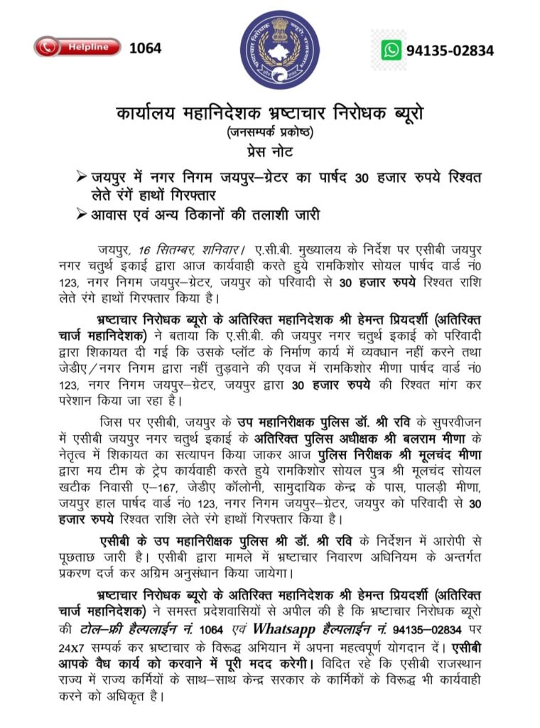 जयपुर में नगर निगम जयपुर ग्रेटर का पार्षद 30 हज़ार रुपये रिश्वत लेते रंगे हाथों गिरफ्तार