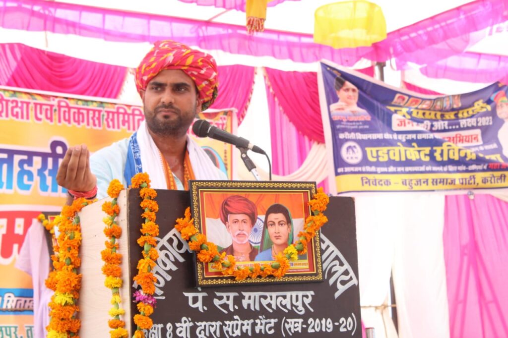विधानसभा क्षेत्र से बसपा प्रत्याशी एडवोकेट रविन्द्र मीना ने रविवार को करौली में बाल्मीकि समाज के विद्यार्थियों की खेलकूद प्रतियोगिता का राजीव गांधी खेल संकुल में फीता काटकर उदघाटन किया। मीना ने बाल्मिकी समाज के युवा खिलाड़ियों को खेल के प्रति जागरूक करते हुए हौसला अफजाई की। इस अवसर पर खेल समिति द्वारा माला व साफा पहनाकर रविन्द्र मीना का भव्य स्वागत सत्कार किया गया। इस दौरान रविन्द्र मीना ने करौली व गंगापुर सिटी जिलों की टीमों के बीच मैत्री क्रिकेट मैंच का बल्ले से शॉट खेलकर शुभारंभ किया। इस अवसर पर रविन्द्र मीना के साथ बसपा जिलाध्यक्ष जमना लाल जाटव, कार्यालय प्रभारी नरेंद्र कुमार, एडवोकेट सुमंत कुमार मीना, सुगर सिंह मीना, भूरा मीना, खेल कमेटी अध्यक्ष गोविंद कुमार, खेल कमेटी उपाध्यक्ष दिलीप, सुरेन्द्र, पवन, मनीष, दीपक, चेतन, शिवा, छोटू सहित सैकड़ों युवा खिलाड़ी उपस्थित रहे।